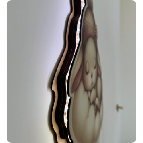 Нічник підсвічується світлодіодною стрічкою, яка для безпеки покрита силіконовим захистом та має захисний короб. Розсіювання світла здійснюється з бокової частини виробу, що повторює його форму та забезпечує рівномірне освітлення з усіх сторін.